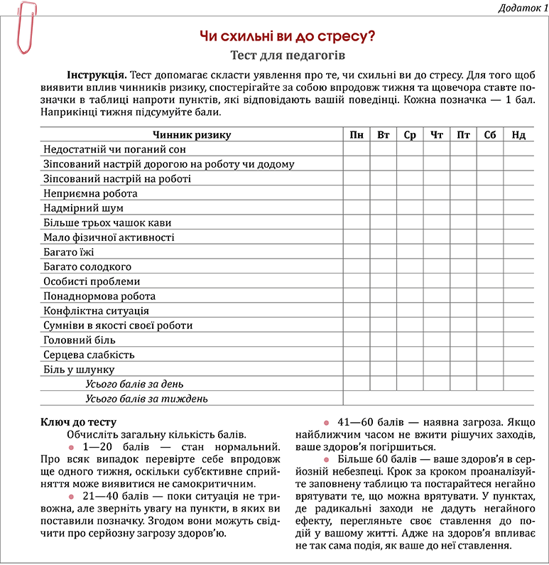 Практичний психолог роздає учасникам бланки тесту «Чи схильні ви до стресу?» та пояснює, як виконувати його впродовж тижня (див. Додаток 1).