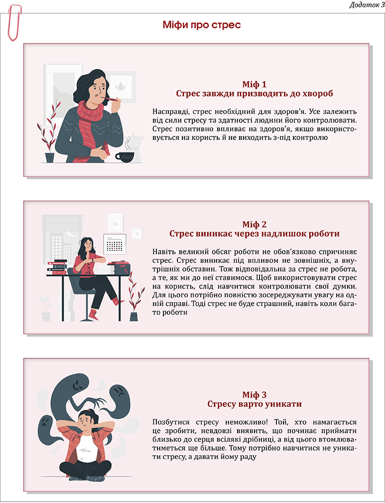 Практичний психолог роздає учасникам картки з описом трьох найпоширеніших міфів про стрес, пропонує ознайомитися з ними (див. Додаток 3).