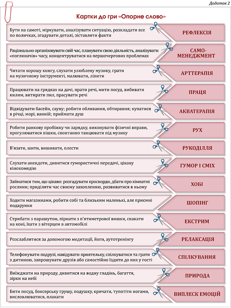 Практичний психолог пропонує учасникам утворити три групи. Кожній групі дає набір розрізних карток, на яких описані способи подолати стрес та опорні/узагальнювальні слова (див. Додаток 2). Учасники мають поєднати відповідні картки і проаналізувати вказані способи.